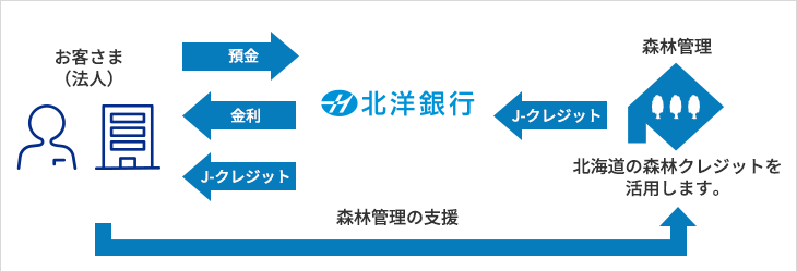 北海道の森林由来のJ-クレジットを活用することで、適切な森林管理に間接的に貢献いただくことが可能です。北洋銀行がJ-クレジットを調達し、北洋銀行が無効化処理(オフセット)をしてお客さまへ無効化証明書をお渡しします。