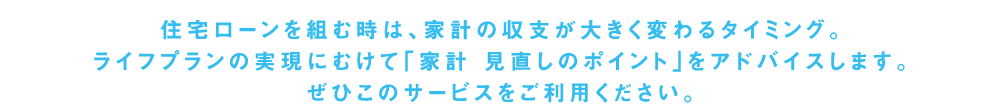 住宅ローンを組む時は、家計の収支が大きく変わるタイミング。ライフプランの実現にむけて「家計 見直しのポイント」をアドバイスします。ぜひこのサービスをご利用ください。