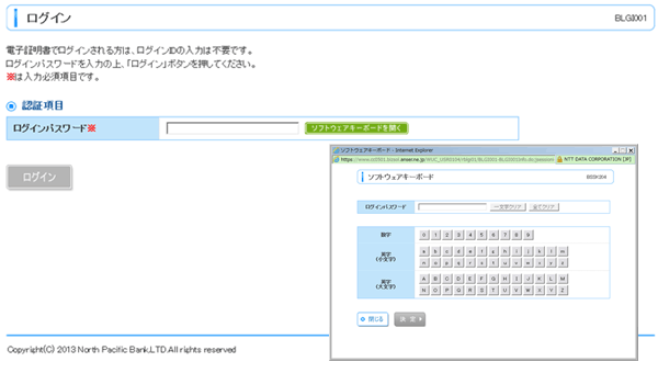 ログオンパスワード等の入力方法については、この「ソフトウェアキーボード」を利用して入力(マウスでクリック)していただくか、通常通り直接入力していただくかのどちらでもご利用いただけますが、マルウェア対策として「ソフトウェアキーボード」のご利用を強くお勧めいたします。